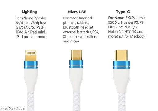 Brand New & High Quality. 3 in 1 High Quality Nylon Braided Type-C Micro USB Data Cable Fast Charge Stable Data Transmission Charging Cable for iOS and Android Devices. This data cable features a Type-C port, Lightning port and Micro USB port 3 in 1 design, one cable can charge for your different devices, covenient and pratical. Braided design is more durable. Tinned copper ensures fast and stable performance. Simple appearance, ultra light body is lightweight and portable, easy for you to carry Compatible with i-Phone X, i-Phone 8/8 Plus, i-Phone 7/7 Plus, Sam-sung S8/S8 Plus, Bluetooth headphone, Power bank, Camera, -book Pro, Goo- Pixel, Nexus 6P, and more other USB devices.