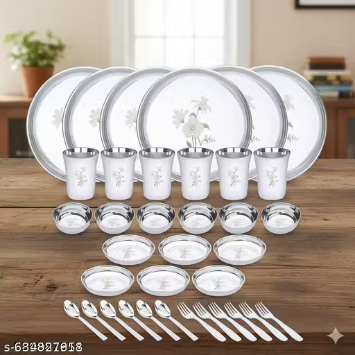 Name: 36-Piece Stainless Steel Dinner Set | 6 Plates, 6 Glasses, 12 Bowls, 6 Spoons & 6 Forks | Elegant Flower Design