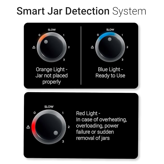 - Compact and modern design with smart jar detection and LED indicators. To ensure safety, the LED lights turn orange if the jar is not fitted properly.