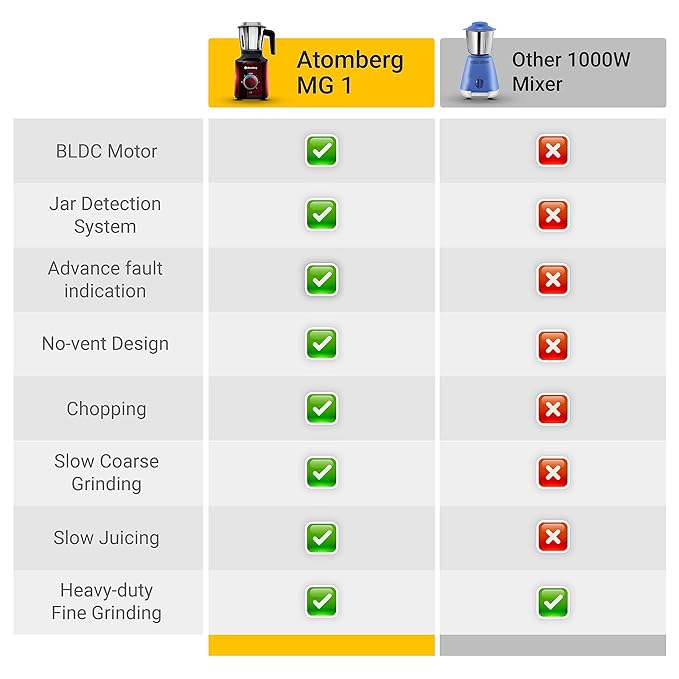 - India’s first Mixer Grinder with BLDC Motor Technology. Consumes less power (485W) and delivers better performance (RPM: 18000, similar to normal mixer grinder with 750W-1000W motor). Grinds the hardest of ingredients like turmeric, masalas, etc. with equal ease.