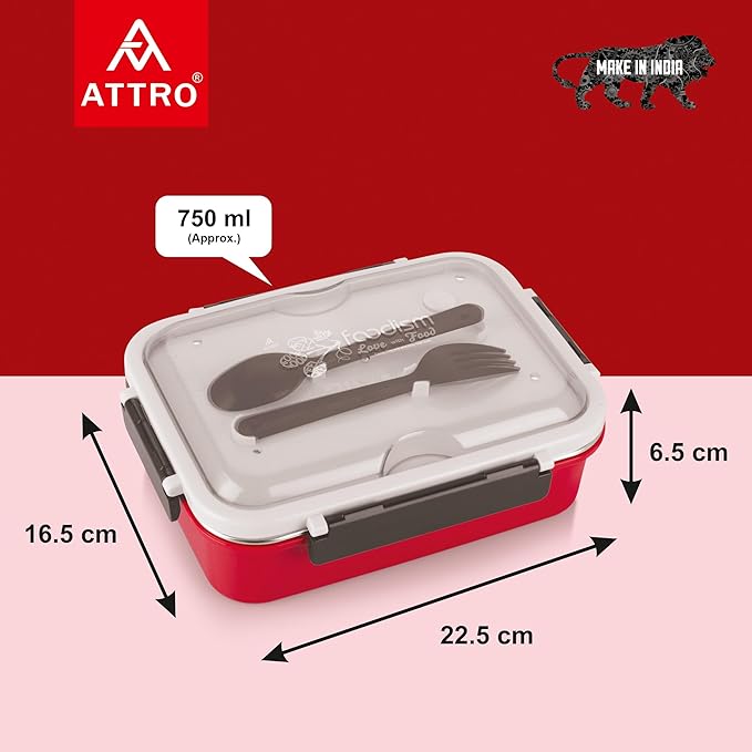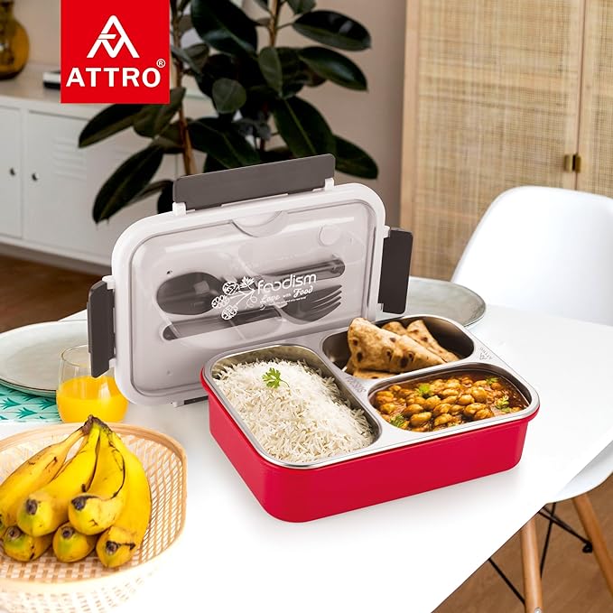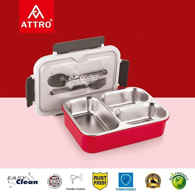Attro A Food Eat 3 Compartment Stainless Steel Lunch Box with Plastic Cutlery Inside, Heating & Water Insulation Design Use for Office, School & Travelling, 750 Ml – Red Visit the A ATTRO Store