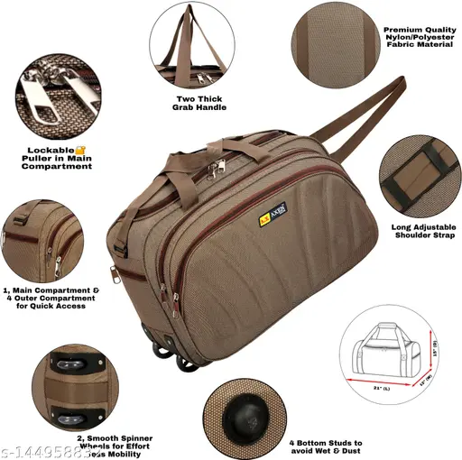 Wide U-shaped opening for main compartment, Additional front pocket for go-to items, Quick Access Pockets, Handle Type : Extendable, Strap Type: Adjustable, 4 Bottom Lugs for Added Base Support. & High Quality Runner Zipper & Chains, Two Grab Handle for Easy lifting While you are traveling, Smooth rolling wheels for Travel comfort, Long lasting Nylon/Polyester fabric for extra durability, Bottom lugs for protection & Avoid Dust and Wet, Clean Outside:- Clean the exterior with towel & diluted liquid shop, (Ideal For: Men & Women).