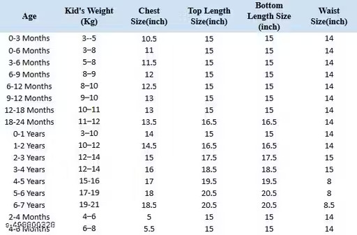 6-12 Months (Top Chest Size : 12 null, Top Length Size: 15 null, Bottom Waist Size: 14 null, Bottom Length Size: 15 null)