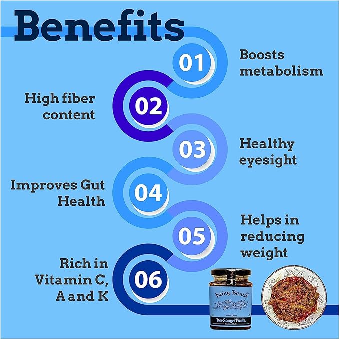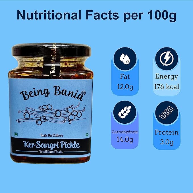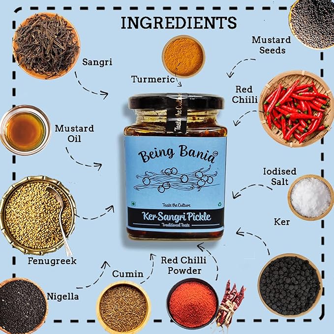 - Being Bania Ker Sangri Pickle while being your go-to partner for all your meals, also brings in tonnes of health benefits. In addition to inidividual benefits of both ker and sangri, the spices in the pickle provide additonal ayurvedic benefits in right quantity for your body. It is time to carry and consume your pickle with pride knowing that you’re taking a good and mindful decision for your health while simultaneously satisfying your taste buds.