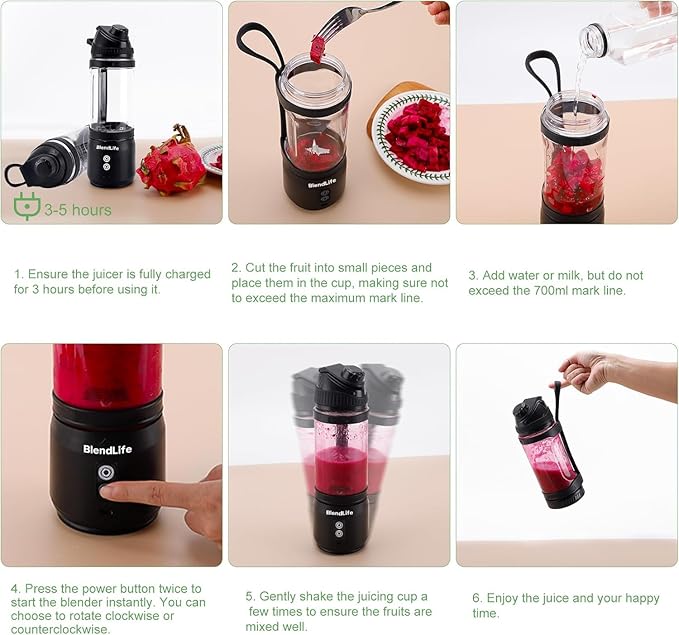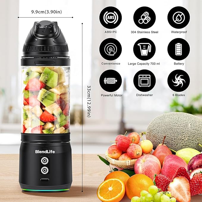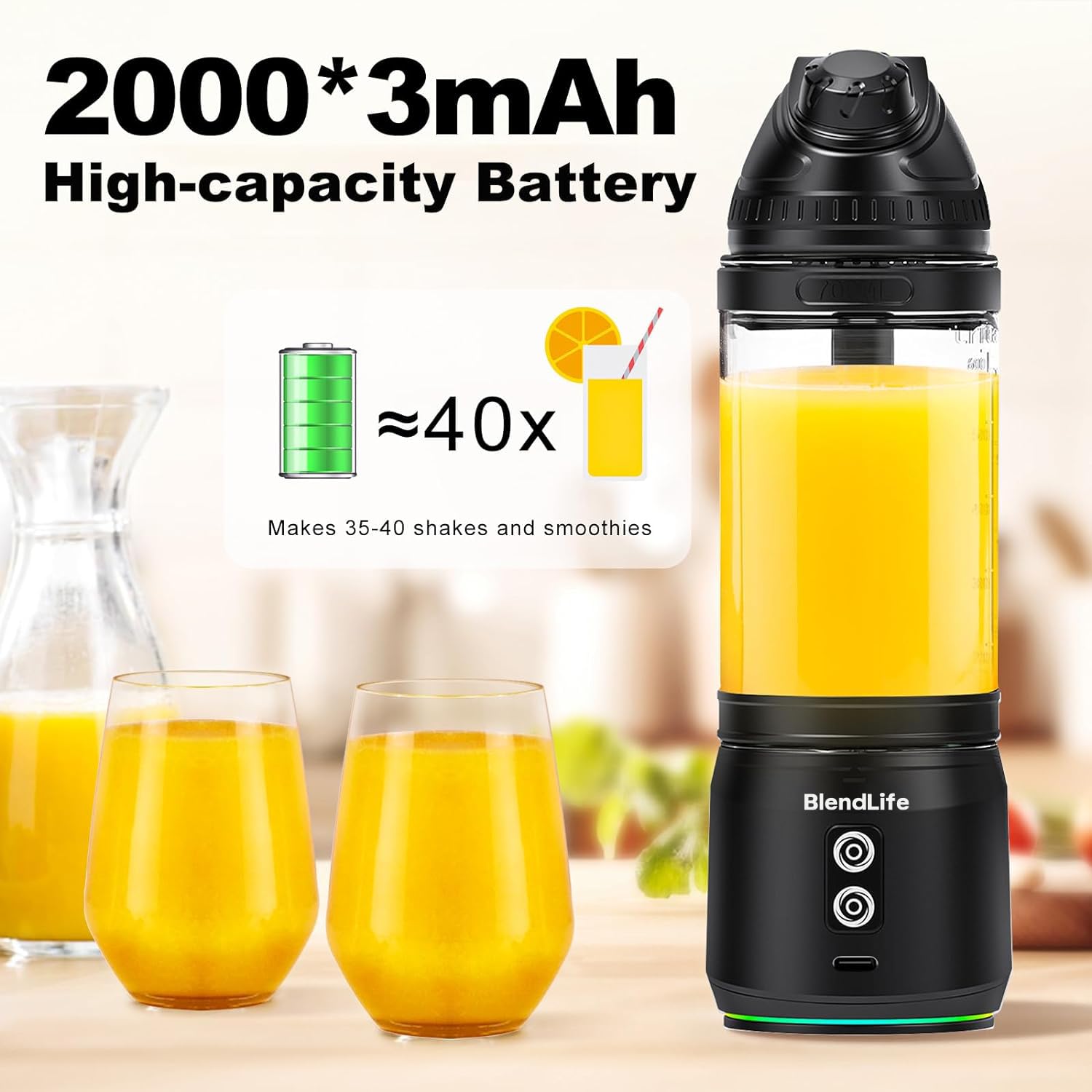 BlendLife Elite Portable Juicer Mixer Blender | 700ml Jar | Reverse Blend, 6000mAh Battery, Waterproof, Dual Modes, LED Lights, Strainer | Perfect for Juices, Smoothies, Shakes & Kitchen Use | Black