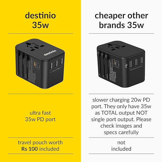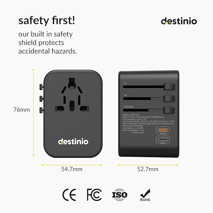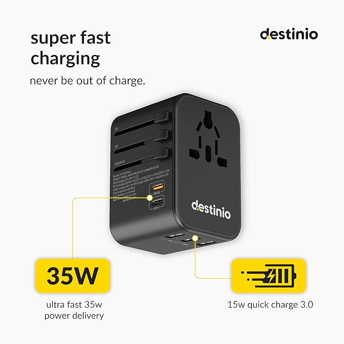- INTERNATIONAL TRAVEL ADAPTER FOR MULTI-COUNTRY USE: Destinio all-in-one universal travel adapter covers 150+ countries, including the USA, Europe, Japan, UK, India, and more. Perfect for global travelers needing a multi-plug adapter to stay connected anywhere. Ideal for europe travel adapters or uk to india adapter plugs
