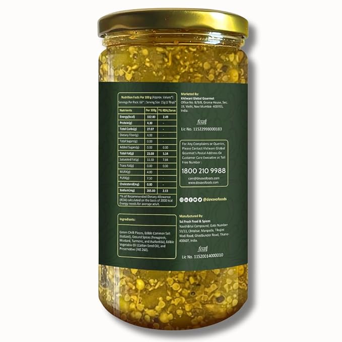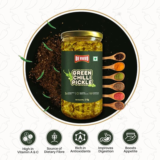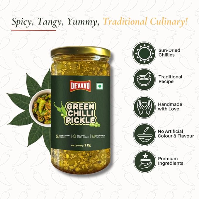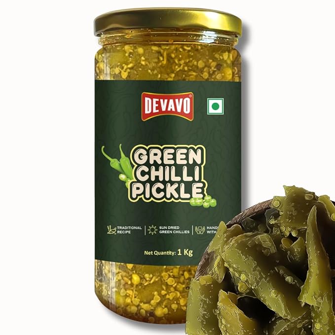 Devavo Green Chilli Pickle 1 Kg | Sun Dried Green Chillies | Traditional Recipe | Handmade with Love | No Artificial Colour & Flavour