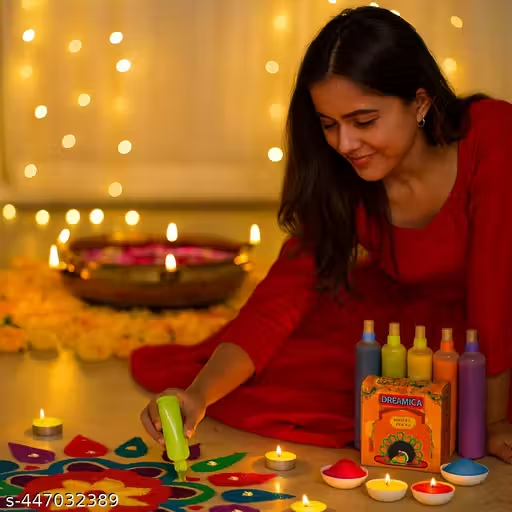 Add vibrant festive beauty to your celebrations with Dreamica Rangoli Colours Pack of 12 — a premium set of finely milled rangoli powders in bright, long-lasting shades. Perfect for Diwali rangoli decoration, Navratri floor art, Pongal kolam designs, wedding entrance décor, housewarming ceremonies, Pooja room decoration, Makar Sankranti, Ganesh Chaturthi, Holi art projects, craft DIY, and festive event setups, these Rangoli colours come in easy-to-use plastic squeeze bottles for neat and effortless designs. Each bottle is filled with smooth, high-quality powdered colours like red, yellow, white, green, blue, pink, orange, purple and more, ideal for home decoration, mandir rangoli, balcony entrance décor, garden pathway designs, cultural festivals, school competitions, art and craft activities, mehendi and haldi functions, and event décor. Safe, non-toxic, and vibrant, these rangoli powders spread evenly, giving professional-looking results even for beginners. Suitable for use with stencils, diya decoration, urli bowls, tealight candles, puja thalis, and festive centerpieces, the Dreamica 12-color rangoli set makes it easy to create intricate patterns and festive vibes. Perfect for festival gifting, wedding decorators, cultural events, community gatherings, bulk use, and reselling on Meesho, this set provides rich, bright pigments that stand out indoors and outdoors. Make your D