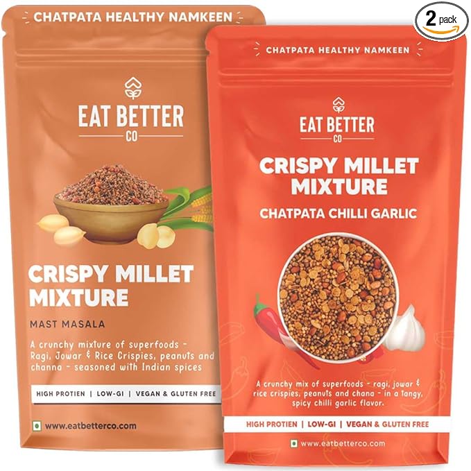 Eat Better Co – Crispy Millet Mixture – Chatapata Healthy Namkeen – Ragi, Jowar, Rice Crispies roasted with Peanuts & Channa (Chilli Garlic & Mast Masala Combo Pack, Pack of Two – 200 grams)