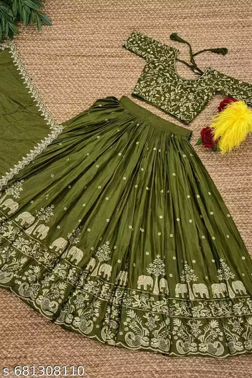 Name: Embroidered Round-Neck Semi-Stitched Lehenga & Unstitched Blouse With Dupatta