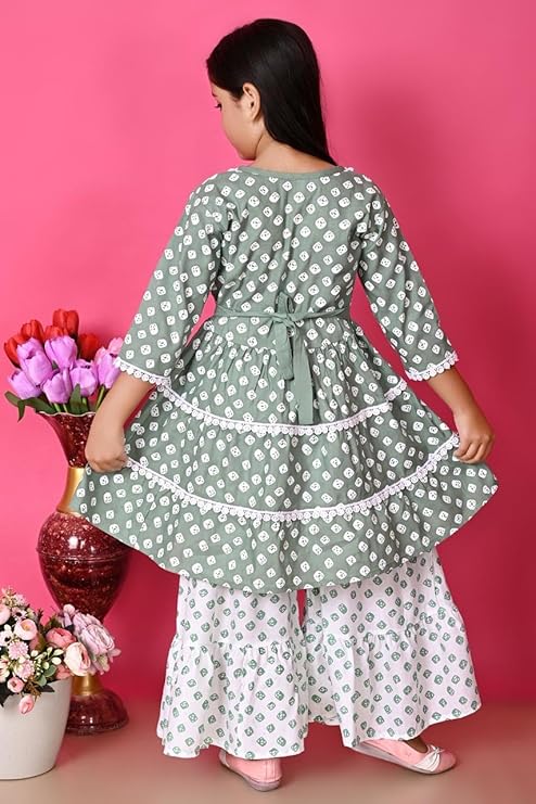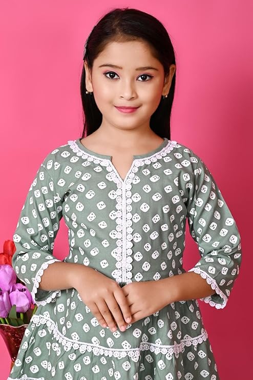 First DREAMGirls Pink Bandhani Printed with Cotton Flower Lace Kurta with Sharara