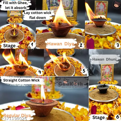 (2) As a Hawan Diya : Soak in ghee or oil for 2-5 minutes. Insert a long wick with one end inside and the other on the edge. This helps the diya burn fully, releasing a spiritual hawan dhuni.