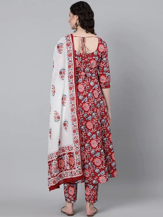 GoSriKi Women’s Cotton Blend Floral Printed Anarkali Kurta Trouser With Dupatta Set (Gym-Red-Gs)