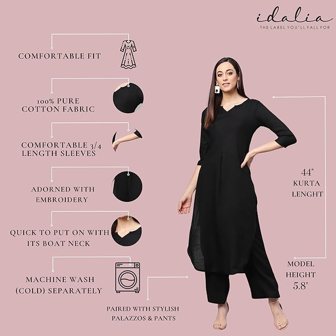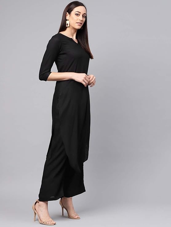 idaLia Rayon Solid Straight Kurta with Palazzo Pant Set – Designer Long Kurta Set, 3/4 Sleeve, Round V Neck, Calf Length