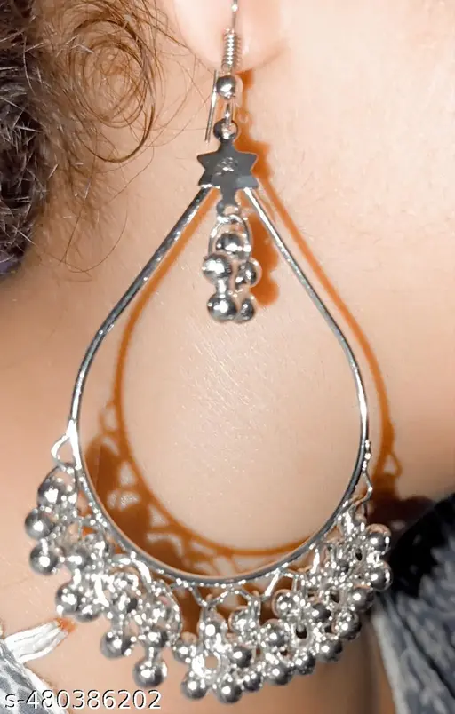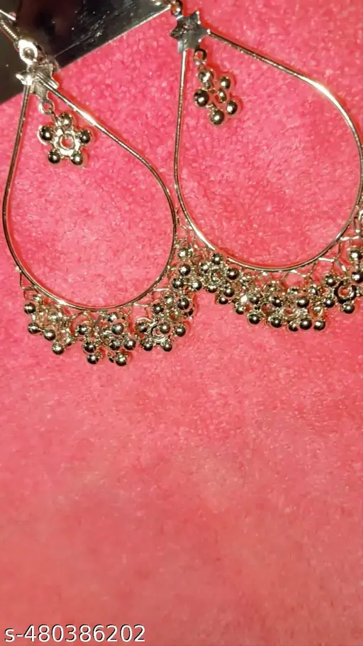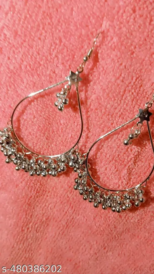 These are a pair of silver-toned hoop earrings with a teardrop shape. The hoops are adorned with small silver beads in a clustered design, and a small floral charm dangles from the top of each earring.