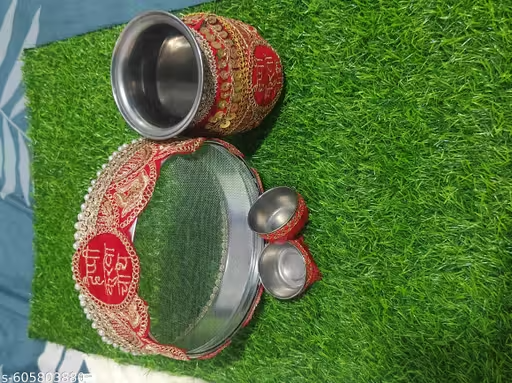 Stainless steel karwachauth puja thali set of 5 piece(thali, lots, katori, chalni) with a good quality decorations to make your vrat special..