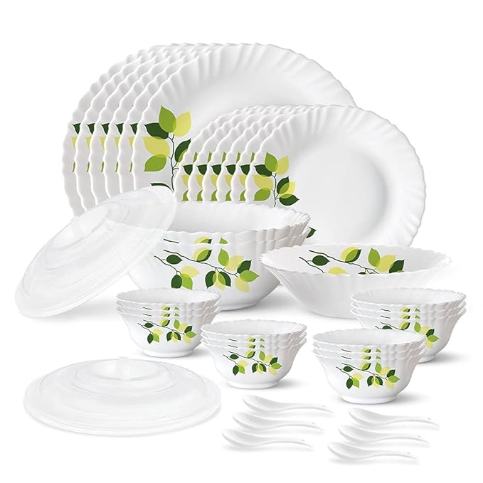 Larah by Borosil Green Leaves Silk Series Opalware Dinner Set | 35 Pieces for Family of 6 | Microwave & Dishwasher Safe | Bone-Ash Free | Crockery Set for Dining & Gifting | Plates & Bowls | White