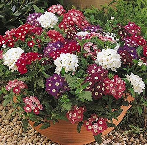 • Verbena has flower clusters that can measure up to 3 inches across, and it will bloom from late spring right up until the first frosts of fall. This mix has shades of rose, scarlet, white and violet.