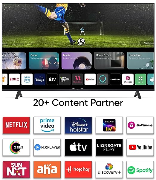 - Smart TV Features: WebOS Smart TV | AI ThinQ | Apple Airplay 2 & Homekit | Game Optimizer| Filmmaker Mode | α5 AI Processor 4K Gen6 | HDR 10 |1.5 GB RAM + 8 GB Storage | Unlimited OTT App Support: Netflix, Prime Video, Disney+ Hotstar, Apple TV, Jio Cinema, SonyLIV, Discovery+, Zee5, Voot, MxPlayer, Google Play Movies & TV, YuppTV, Youtube