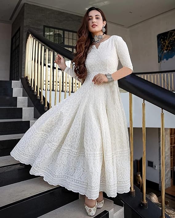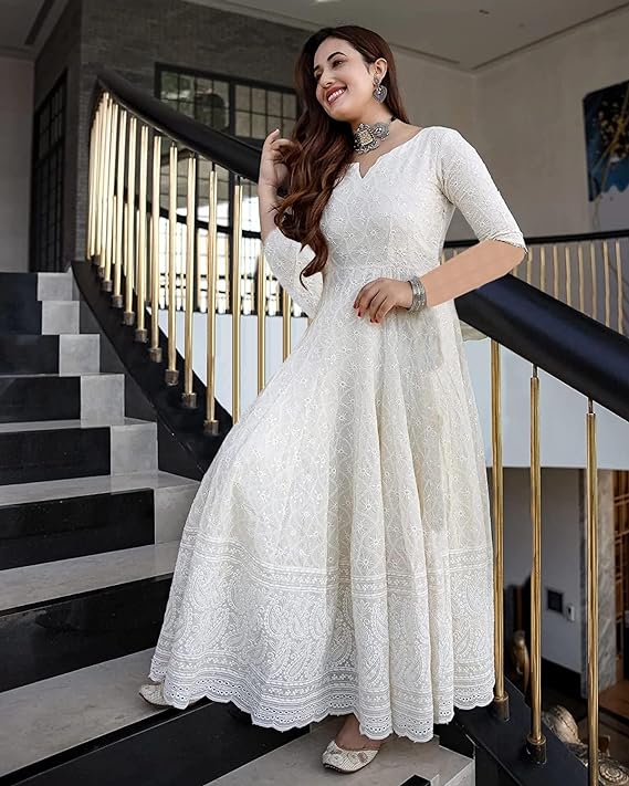 LookMark Women’s & Girl’s White Color Chikankari Long Kurti Gown