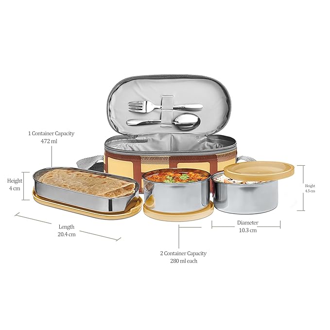 • Soft insulated tiffin which keeps food hot, it contains two round and one oval containers. It is available with fork and spoon comes in special storage slot.