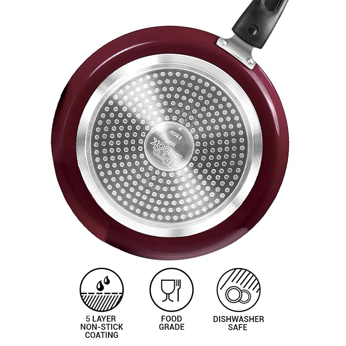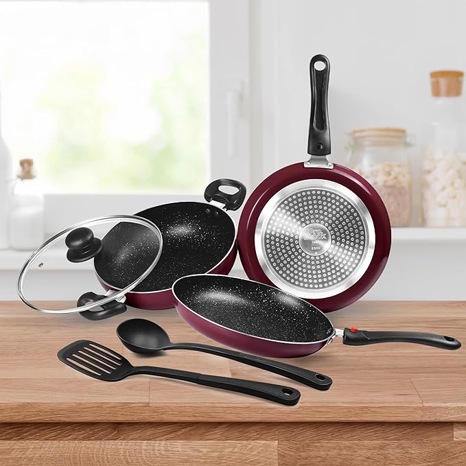 - This is PFOA Free non-toxic and lightweight, you can enjoy food absolutely worry-free. It has 5 layers of Non-stick coating which requires less oil. This kitchen set has nylon ladle and spatula for better serving and cooking