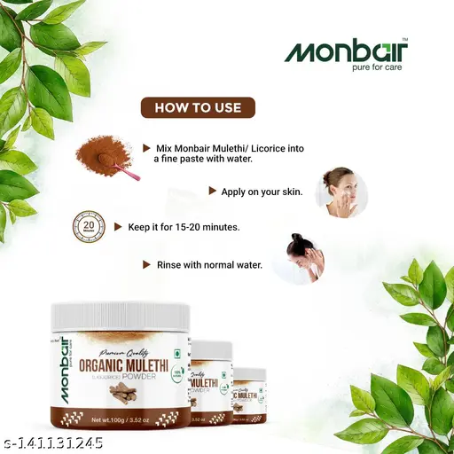 Monbair mulethi / liquorice Prevents sun damage. Regular exposure to the sun can cause dark spots and age spots making you look older than your age . Brightens skin . Fades scars. Treats wrinkles. Prevents hair fall. Cures dandruff. Promotes hair growth. Prevents premature greying. Mix 1 tbsp each of amla and Monbair mulethi powder with a spoonful of rosewater or milk and apply it all over your face. Use this face pack on alternate days to improve the radiance of your skin . In the case of oily skin, it is best to apply a face mask of a paste of Monbair mulethi powder and Monbair red sandalwood powder along with rose water to control excess secretion of sebum. In a bowl, add two tablespoons of Monbair mulethi powder with one tablespoon of honey. Mix well to make a thick paste, and then add a teaspoon of lemon juice, combine the ingredients well.If the paste is too thick, add a teaspoon of rose water.Apply evenly on cleansed face and allow it to stay for 25 minutes, and then wash off with cold water.Repeat twice a week for best results. How to use Monbair Mulethi powder for Hair In a bowl, take a cup of curds, to this add five spoons of Monbair mulethi powder along with two spoons of olive oil. Mix all the ingredients well and apply all over your hair and scalp, massage for a few minutes then let it stay for another 15-20 minutes . Wash off with lukewarm water.