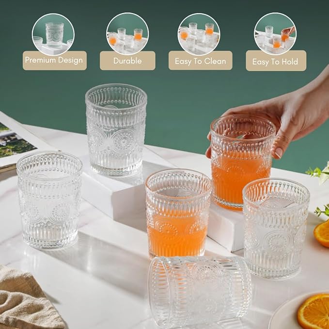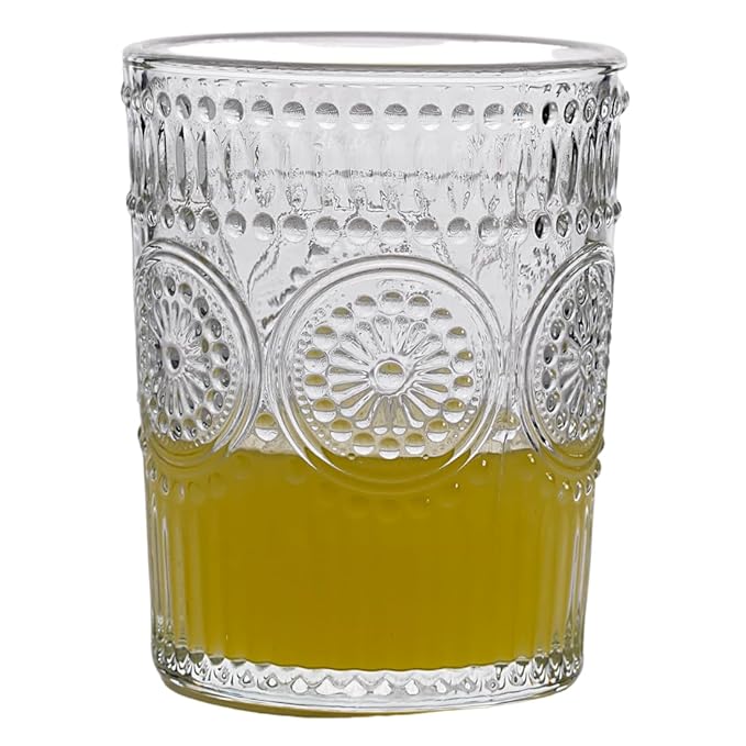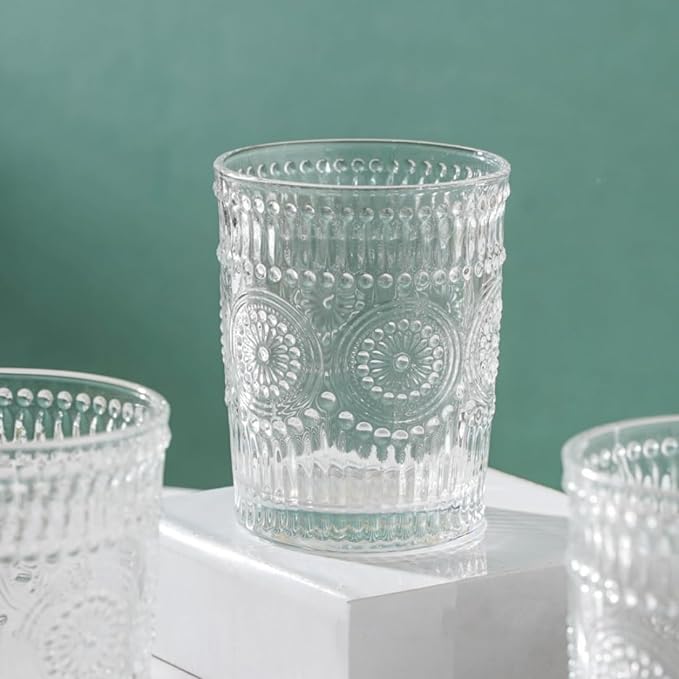 Nestasia Set of 6 Embossed Water Glasses | Vintage Pressed Glassware for Hot & Cold Beverages | 250ml, Transparent