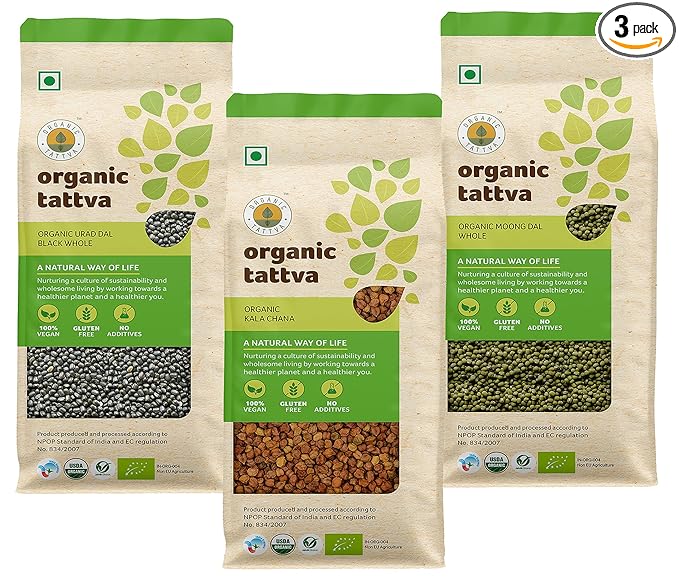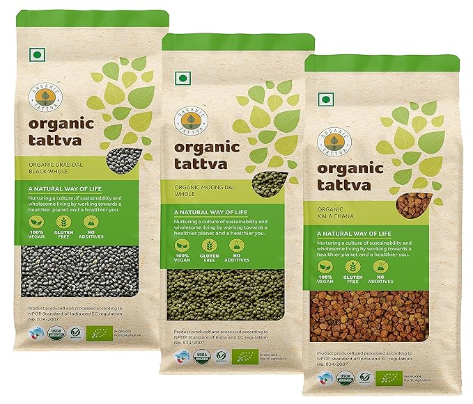 Organic Tattva, Organic Pulses / Dal Sprouts Combo (Kala Chana 1Kg, Green Moong Dal 1Kg and Urad Black Dal 500g) Whole/Sabut Dal Combo Pack | Rich in Protein |Naturally Gluten Free | Unpolished Dal | Pesticide and Chemical Free | Pack of 3