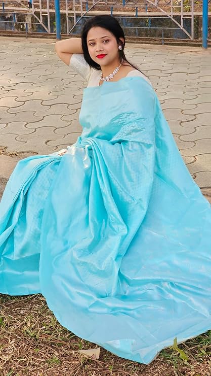 - **Fabric**: Made from soft, lustrous **litchi silk**, known for its smooth texture and natural sheen. – **Weaving**: Features traditional **Banarasi weaving**, often with intricate **zari work** (gold/silver metallic threads) for added richness. – **Designs**: Adorned with elaborate motifs like lotus flowers, paisleys, and geometric patterns, showcasing fine craftsmanship. – **Color Palette**: Available in rich, vibrant colors like red, blue, gold, and green, with contrasting borders and pallu. – **Border & Pallu**: Broad borders with intricate zari patterns; a richly designed pallu as the focal point.