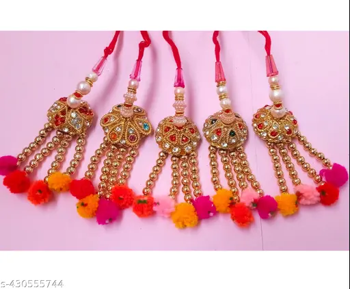 this package contains 5 pcs lumba rakhi with roli chawal.