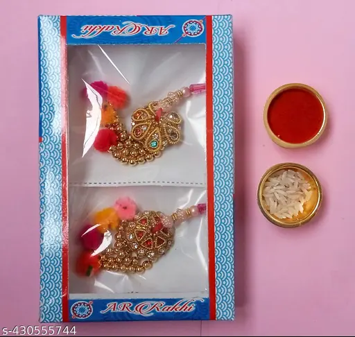 Rakhi for bhabhi / lumba rakhi set ( 5 pcs ) with roli chawal and nice rakhibox packaging.