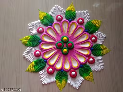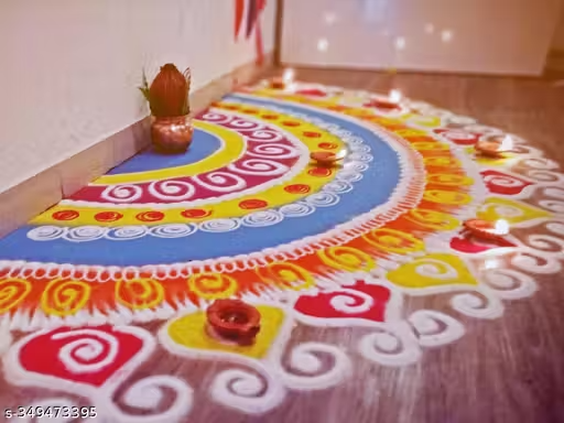 Rangoli, also known as Kolam or Muggu, is a folk art from India in which patterns are created on the floor in living rooms or courtyards using materials such as colored rice, dry flour, colored sand or flower petals. It is usually made during Diwali (Deepawali), wedding, Onam, Pongal, and other Indian festivals. Colour is made of Sawdust. These colors are Eco-friendly. we provide different colors in each packet.