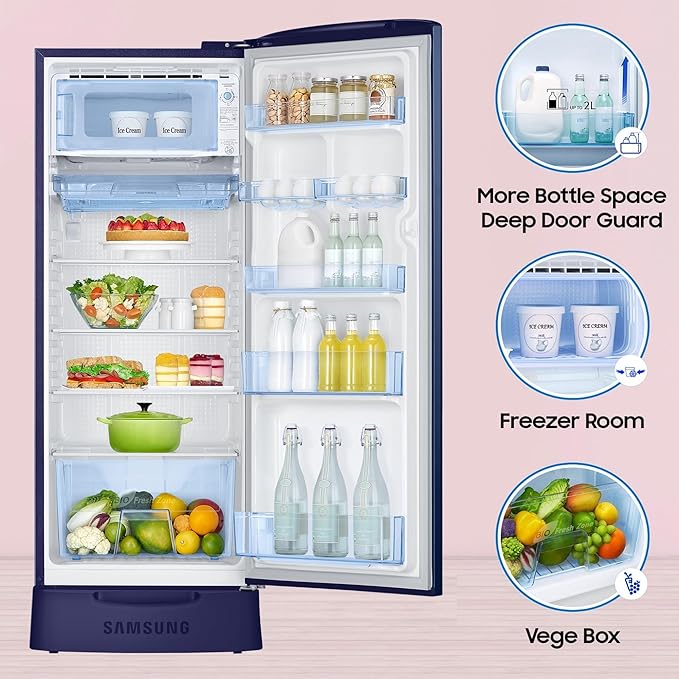 Samsung 223 L, 3 Star, Digital Inverter, Direct-Cool Single Door Refrigerator (RR24D2Z23CU/NL, Camellia Blue, Base Stand Drawer, 2024 Model)