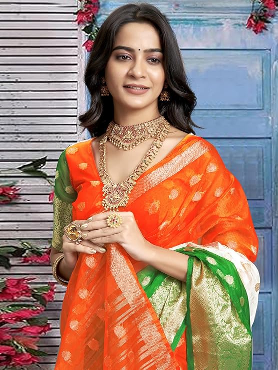 Satrani Women’s Oraganza Printed & Jacquard Border Independence Day Special Tricolor Tiranga Saree With Unstitched Blouse Piece