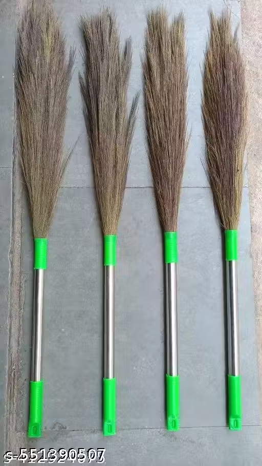 THREE STONE- (Pack of 4) Steel Pipe Kleen Sweep Natural Grass Broom Stick for Home Cleaning | Phool Jhadu with 18 cm Long Handle | Housekeeping & Cleaning Supplies Product for House & Office
