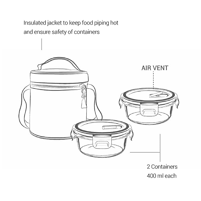• Materia type: Transparent Glass; No. of containers: 2; Capacity of containers: 2 Containers: 380ml Each; Contents include: 2 – Pieces All Fresh Borosilicate Tiffin (400 Ml Each); Colour: Transparent