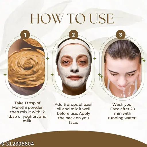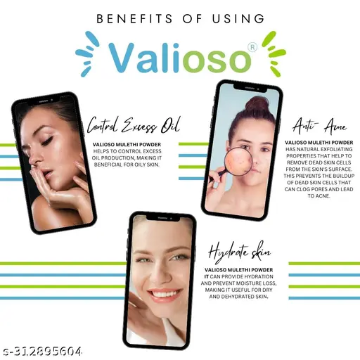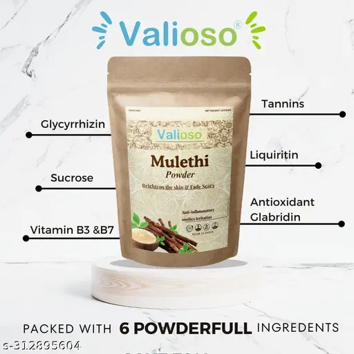 Valioso Mulethi Powder is 100% pure and organic : Contains only mulethi powder obtained by crushing the roots of mulethi plants organically grown in select Indian farms. Naturally processed, no added chemicals: A microfine, triple-sifted root powder that has no added preservatives or fragrances, also has no traces of pesticides or fertilisers. Mulethi Powder makes the skin clear and protects against harmful sun rays and environmental pollution.