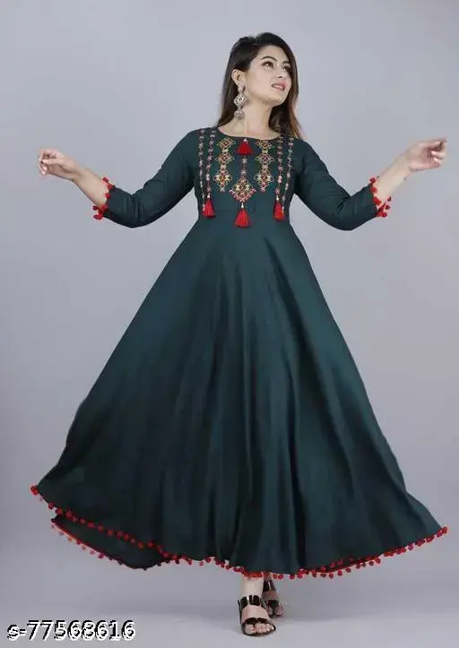 Elevate your wardrobe with this exquisite anarkali kurta, perfect for festive and casual party occasions. Crafted from soft and breathable rayon fabric, this kurta features elegant three-quarter sleeves and is adorned with intricate floral embroidery, adding a touch of tradition to your look. The single-piece kurta comes in a variety of sizes, ensuring a comfortable fit for all. The anarkali’s fit and flare shape flatters the silhouette, while the rich dark green color exudes sophistication. The hem is playfully detailed with contrasting red tassels, enhancing the garment’s charm.