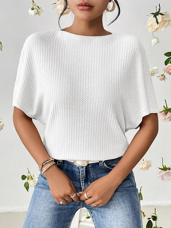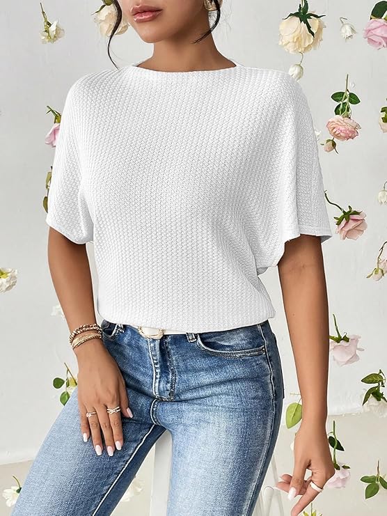 - Features: this shift top shapes with classical Boat neckline, Batwing Half sleeves, waffle (cotton) materail, a relaxed bodice that falls into a straight hemline!